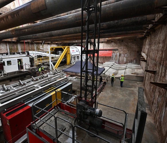 Наша компания установила в котловане тоннелепроходческого комплекса на станции станции «Рублево-Архангельское» грузопассажирский подъёмник Scanclimber SC 1432. Это оборудование позволяет сотрудникам и персоналу спускаться на дно котлована к тоннелепроходческому комплексу «Александра» и выполнять необходимые инженерные работы.